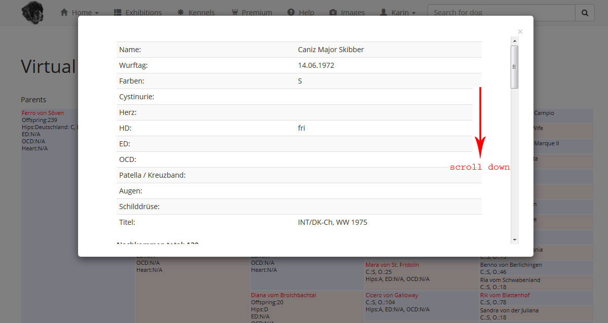 Here you can click onto each dog and a pop-up opens with all information also from its offspring